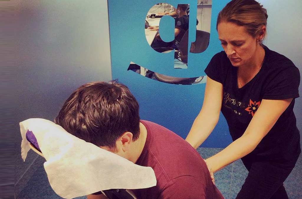 A modern massage treatment using pressure points on the back, neck, shoulders, arms, hands and head to stimulate the circulation and the nervous system.